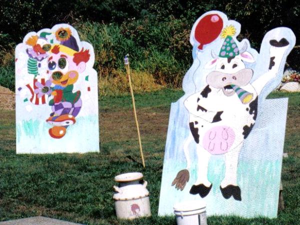 These were done for Carnival theme, BBQ. They were used for games, the Clown was used as bean bag toss through eyes and nose etc. The Cow was used as a milking game attached a pink rubber glove with holes in fingers and people had to try and milk the cow. They had a lot of fun with this.