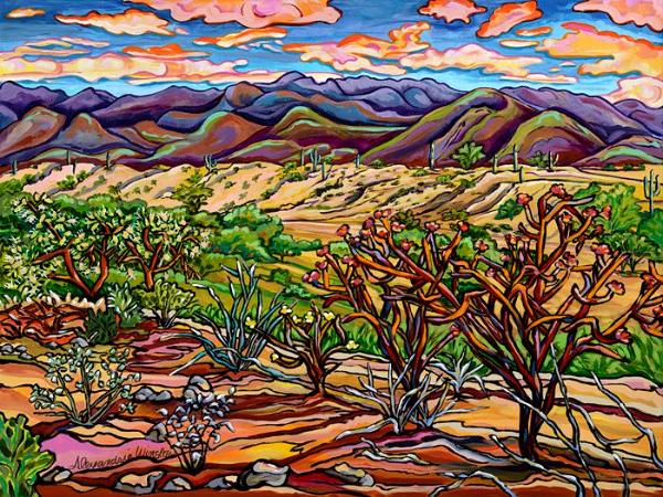 We were hiking with friends and I found this daytime desert scene near the Tortolita Mountains in Arizona irresistible. Desert landscape paintings are some of my favorite and can be quite challenging! The cholla cactus present such tangled up beauty! There is so much more color in the desert than most people take time to see.