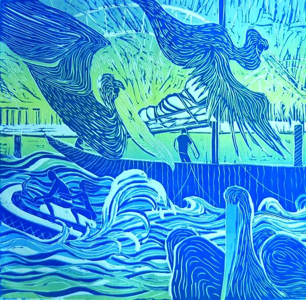 Linocut print on white paper featuring rainbow roll multi-color inking. Image size 12" x 12". Edition limited to three.