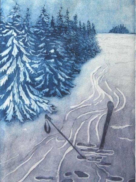 Copperplate with two tones of ink on BFG rag paper. 7" x 10". Signed Original.