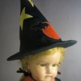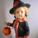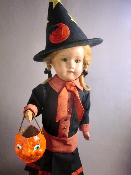 Miss Dolly is the star of this Halloween season in her orange and black frock and witch's pointed hat.