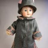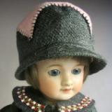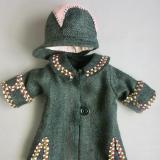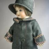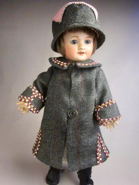 Her matching brimmed cloche is a pattern from La Semaine de Suzette, also from 1927. Sewn from the charcoal gray twill and a rose colored brushed wool, it is embellished with hand embroidery and lined in silk.