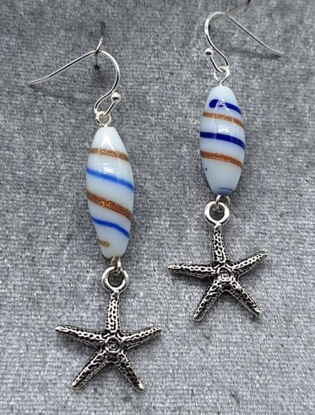 2.5" long. Silver starfish with blue & gold striped glass bead. Silver plated wires.