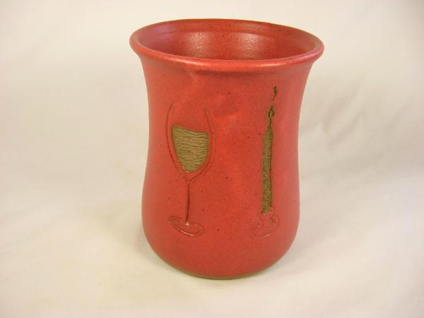 120213.A Freehand Carved Red Wine ChillerBrownstone stoneware clay body with satin cherry glaze. The wine glass and candle are free-hand carved, and wax resist was used to create the contrasting bare areas.