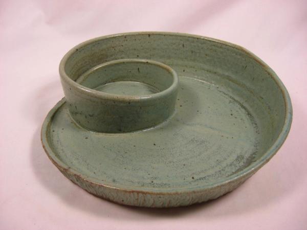 Brownstone stoneware spiral chip-n-dip with carved exterior and mint green glaze.