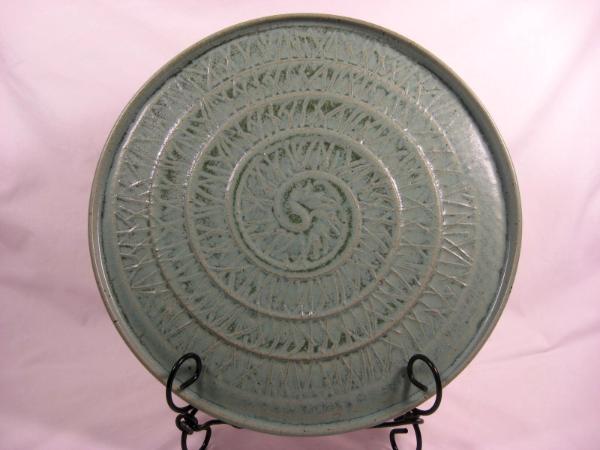 Brownstone stoneware platter with spiral design. A hand-carved rolling stamp was used to make the design on this platter's surface.