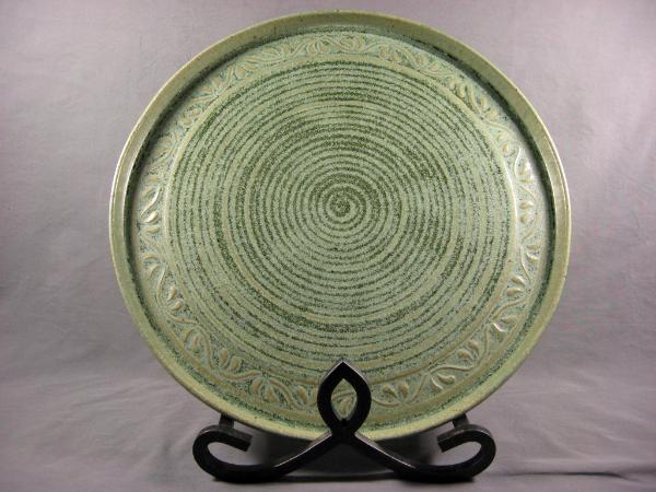 Brownstone stoneware platter with hand-carved roller stamp design.