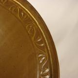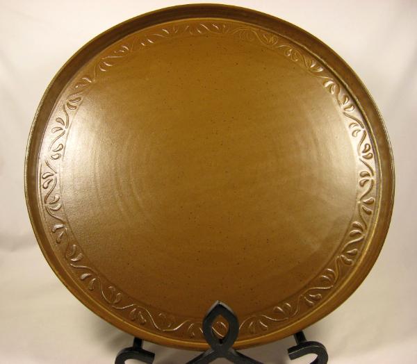 Brownstone stoneware platter with shino glaze.  The edge design was made using a hand-made rolling stamp that was free-hand carved and bisque fired.