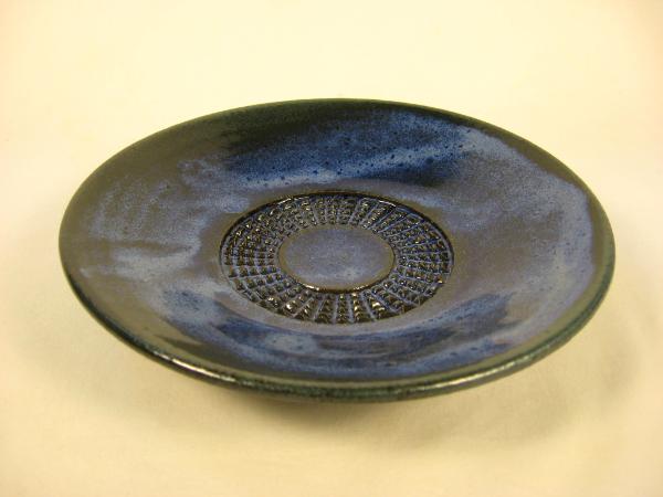 Brownstone stoneware garlic plate with carved grater and blue glaze.