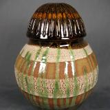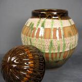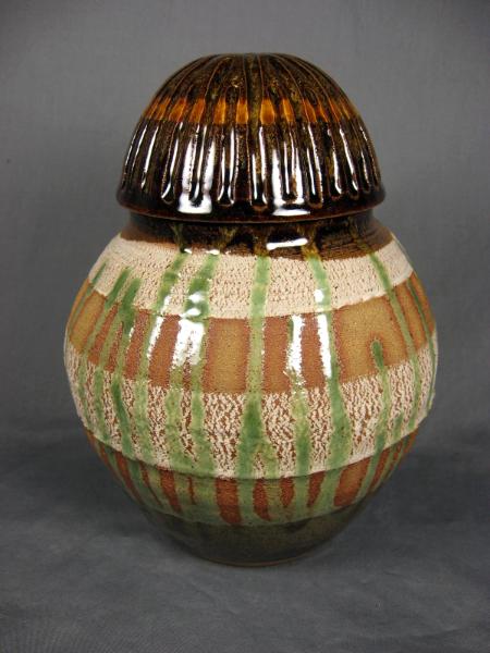 Brownstone stoneware urn for a loved one's ashes. This urn's cracked surface was made using sodium silicate impregnated porcelain slip, and then thrown with one hand to shape and expand the piece from the inside in order to create the cracking of the porcelain bands on the exterior of the urn.