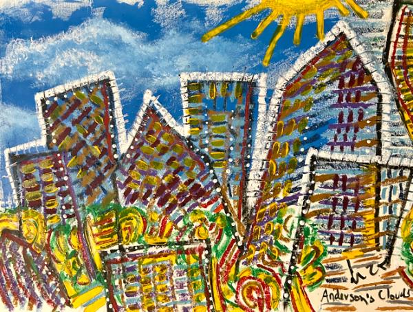 This is a collaboration piece between my friend Anderson and I. He wanted to paint on my pad and made a sky and some clouds. I added the city. oil pastels and acrylics on paper, 18x24