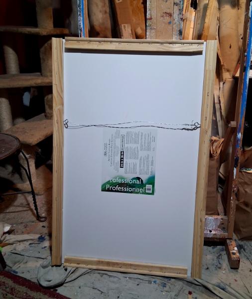 When I get canvas panels, I usually make my own backing for them, so they can be wired and hung. This is a 24" x 36" panel upon which an abstract will be created.