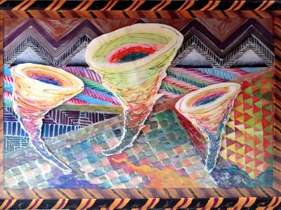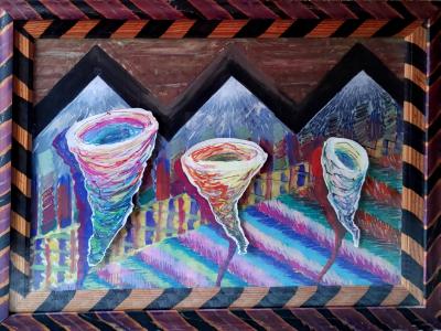 The Wizard of Oz, it is a tornado that takes Dorothy from Kansas into a world of fantasy. To me, whirling winds are a way out of a boring existence. But in 2022, a viewer can see tornadoes representing the severe climate changes that are an overarching concern. Dark and violent seas, stormy sunsets, and cyclones can be predictors of an uncertain future. A simple image of a balloon trip over the Great Wall of China can now appear to be drones and the threat of an Asian incursion.