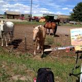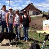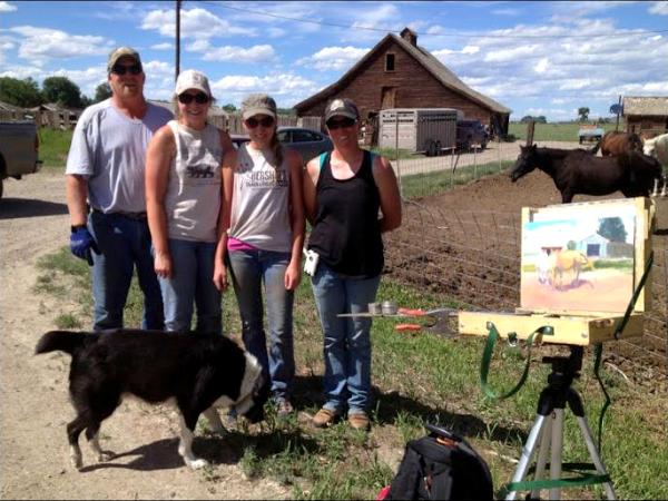We stopped in a tiny town south of Billings and spotted these beautiful horses. I jumped out of the truck and went to the barn where I saw a man working. I asked if I could paint his horses. He said ok and asked if he needed to move any one of his pieces of equipment so I could get a good view. He then came out after 20 minutes and to see what I was doing and I told him to return in an hour. He did and he brought the whole family. They were so pleased with my painting that I had to take of picture of them. They had errands to run and vanished. When I was packing up I took the painting of the horses and placed it in a prominent place in the barn for them to find upon their return. It's moments like that that makes me love plein air.