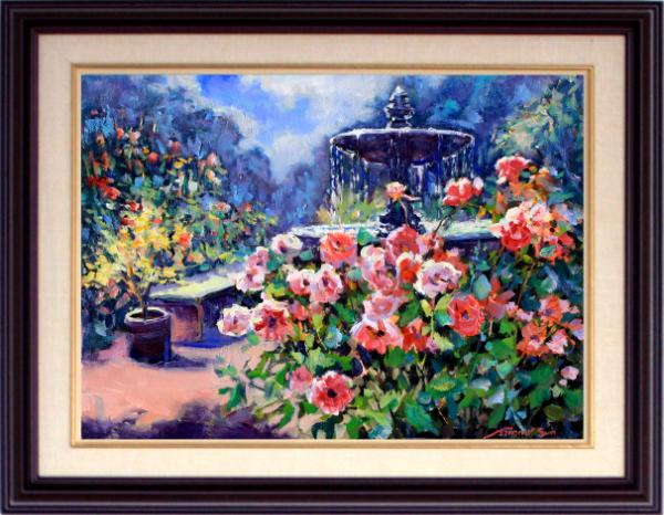 Where petals sway and fountains meet,
