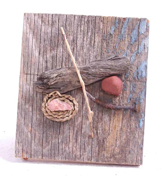 Found-wood base, red clay ball, stick, 5 3/8" x 6 3/4" x 1 1/2"