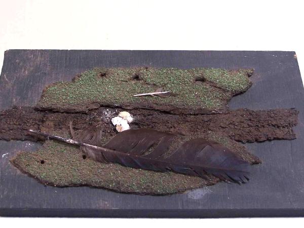 Abstract, The Year The Crows Came,Shingle, feather bits, pebbles, 11 7/8" x 8 1/2" x 7/8"unsigned, no dateFeather & 1 pebble loose