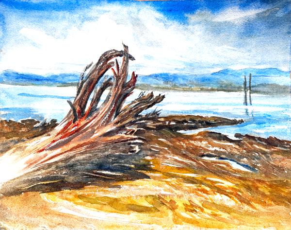 English Boom Spring. Driftwood on the beach.