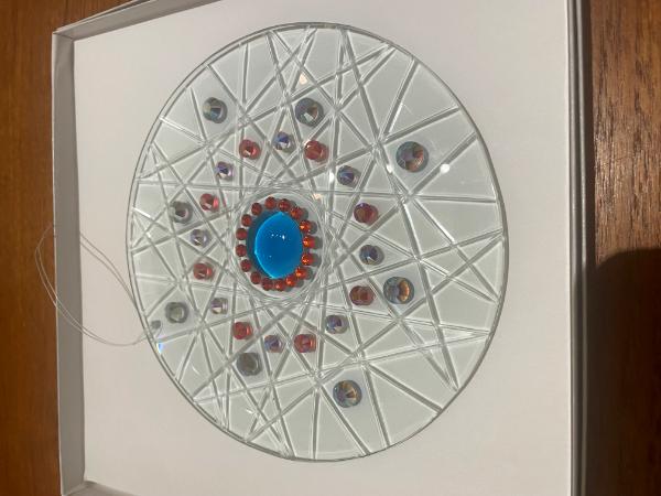 The 6"Ø beveled and engraved Sun Catcher is embellished with brilliant Swarovski Rhinestones - Blue Jewel in the center