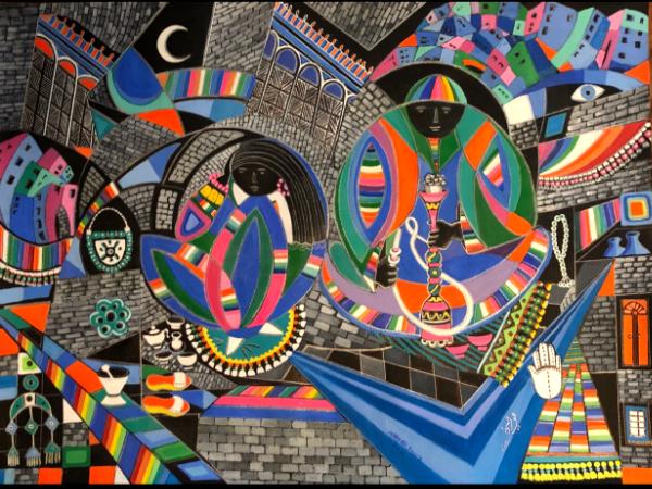 The bright  and vivid colors  in May Alsouz’s paintings  are art for the sake of art only . They  do not bear  connotations and concepts  of a certain organization  or a  special society  . Her art does not  Symbolize  a particular group of people or a party. The colors May Alsouz uses in  most of her paintings are primarily inspired by the pure , vivid  colors and   Beautiful symbols  that are heavily used In daily life in the countryside of her original country, Iraq.