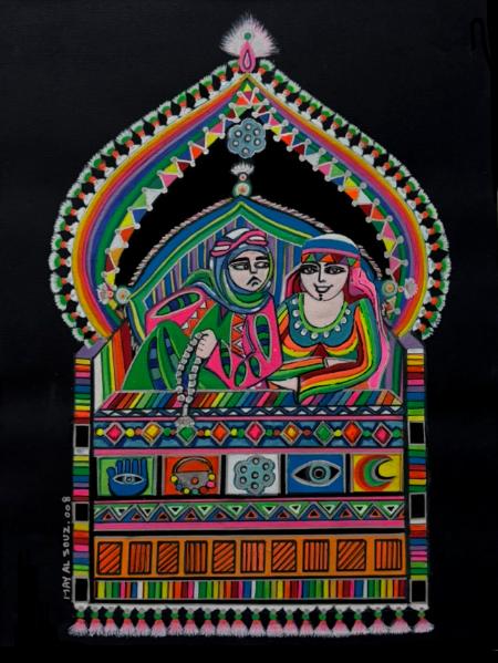 The bright  and vivid colors  in May Alsouz’s paintings  are art for the sake of art only . They  do not bear  connotations and concepts  of a certain organization  or a  special society  . Her art does not  Symbolize  a particular group of people or a party. The colors May Alsouz uses in  most of her paintings are primarily inspired by the pure , vivid  colors and   Beautiful symbols  that are heavily used In daily life in the countryside of her original country, Iraq.