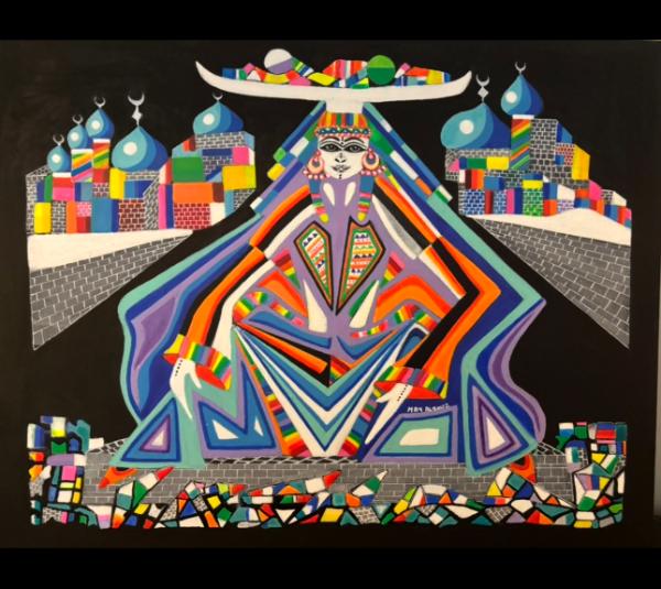 The bright  and vivid colors  in May Alsouz’s paintings  are art for the sake of art only . They  do not bear  connotations and concepts  of a certain organization  or a  special society  . Her art does not  Symbolize  a particular group of people or a party. The colors May Alsouz uses in  most of her paintings are primarily inspired by the pure , vivid  colors and   Beautiful symbols  that are heavily used In daily life in the countryside of her original country, Iraq.