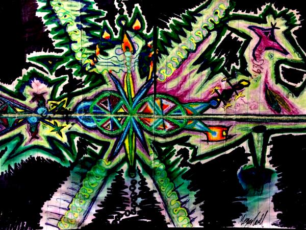 - Ink, colored pencil and graphite on paper; 10.5" x 7.5"; 2004. Original available but damaged.