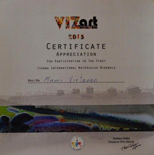 The recognition certificate of my participation in the FIRST INTERNATIONAL WATERCOLOR BIENNIAL OF TIRANA that took place in Tirana, Albania
