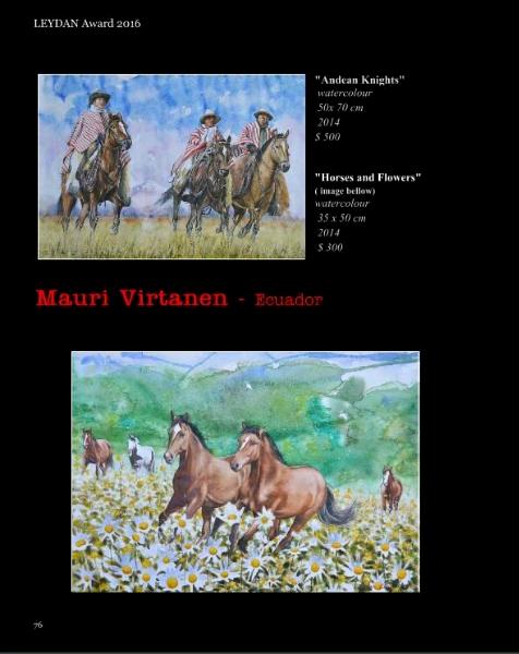 "MAURI VIRTANEN is made to shine, this is told by his unblemished traces and by his powerful creative spirit. This is why I appeal to his enormous faiht for him not to desmay, because beyond his talent is consistency wich will consolidate without any doubt his steps in this universe that only the chosen have a space".