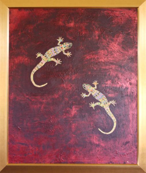A burgundy and copper background with vibrant patterned gecko's outlined in gold. With a gold frame. 120x90.