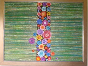 Tranquil green background with textured gold lines and colourful textured flowers.