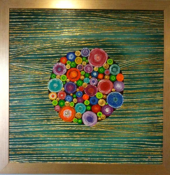 A background of greens with textured gold lines surround a circle of textured colourful flowers.