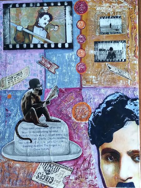 24" x 18" mixed media on canvas. This piece is based on Chaplin's movie The Circus. The monkeys in the movie made me want to create this painting.