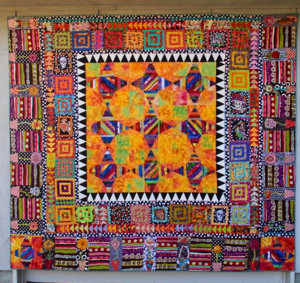 Commissioned quilt. King sized. Center medallion is a grid of pieced pinatas using hand dyed flannel. The frames traditional blocks using imagery from Mexico.
