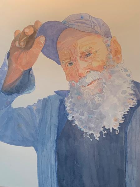 Transparent watercolor of an old fisherman from Bodega Bay. He is tipping his hat to the morning sun. Framed in a single white mat, plexiglass and a low profile Matt black metal frame. Size 16”x20 vertical. Matted and framed ready to hang.