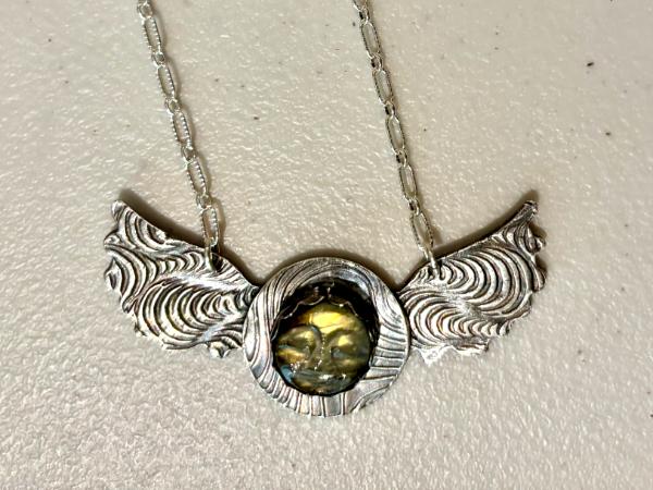 Carved labradorite stone sits on a pair of fine silver wings and hangs from a Sterling silver chain.