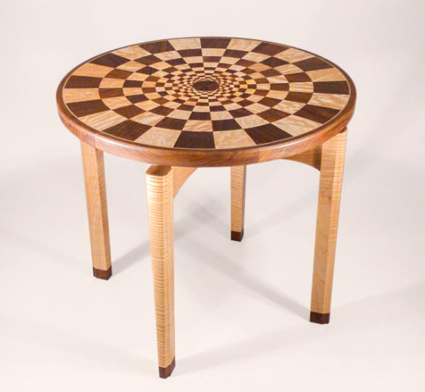 Artist directory :: Russ Riddle DesignsAn Op-Art Occasional Table in walnut and quilted maple. 25" dia x 22" h As opposed to 2-dimensional works, having this pattern on a 3-dimensional piece encourages you to see the pattern change as your perspective changes.