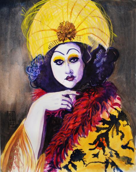 Artist directory :: Diana Blackwell Fine ArtWatercolor portrait of model Florence in a colorful yellow, red, and purple costume that suggests the late nineteenth century.