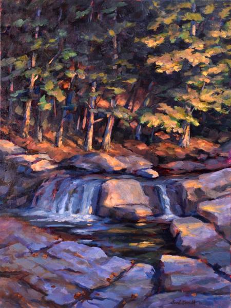 One of a series I painted in 2024 of New England Waterfalls I visited early fall of 2023. This is the first one I painted. It is the only one done in vertical format. I called this the welcoming image, I painted it with a large foreground of rock that would invite a viewer to move in mentally onto the rocks. The painting is one of only two in the series in oil. The vertical format allows a more open and less intimate appearance, it invites you to come in and sit mentally by the cool water. Sold first time it was showed on opening day in a solo show.