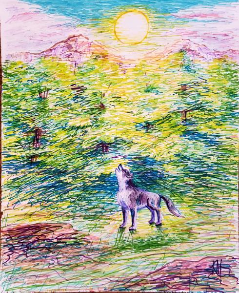 Artist directory :: katnaj Artworks *Colors in Harmony* Earth, Life,...Sharpies Ink/Variations of Greenery Wolf landscape 14" x "17 Mixed media paper