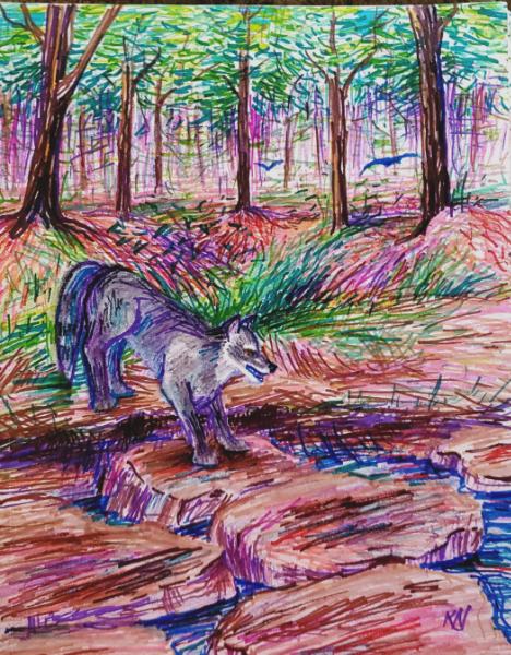 Artist directory :: katnaj Artworks *Colors in Harmony* Earth, Life,...Sharpies Ink Wolf and rocks landscape 9" x 12" Mixed Media paper