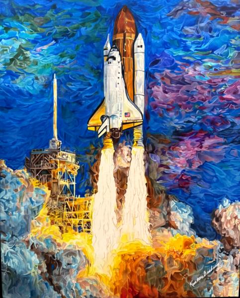 Artist directory :: Kristine BuchananMy nephew wanted a painting of the Challenger, but in an Impressionistic style. It was fun to paint, but it took a long time! It is painted mm 16mm Habotai silk and mounted on a stretched canvas. Commission/SOLD