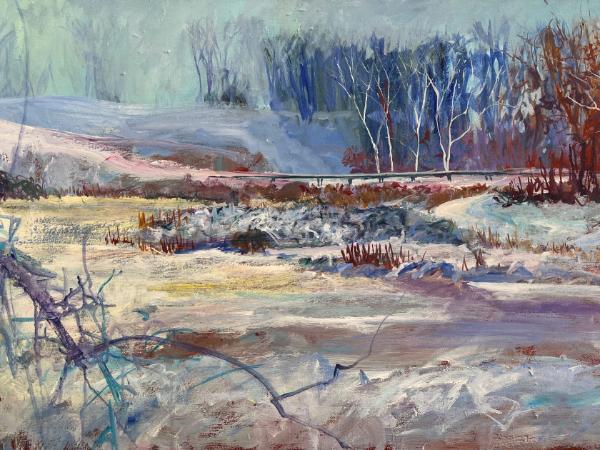 Artist directory :: Melissa Blue Fine ArtWinter at the Nippersink Forest Preserve, this painting focuses on the ice on the pond on a frosty day. In the distance the graceful boardwalk draws a crisp line delineating the distant pond edge. 24x36"