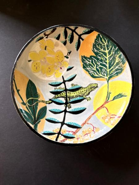 Medium Bowl with Lizard and Orchids White Stoneware 7.5" d x 1.75" h Dishwasher/Microwave Safe Inv.# 20