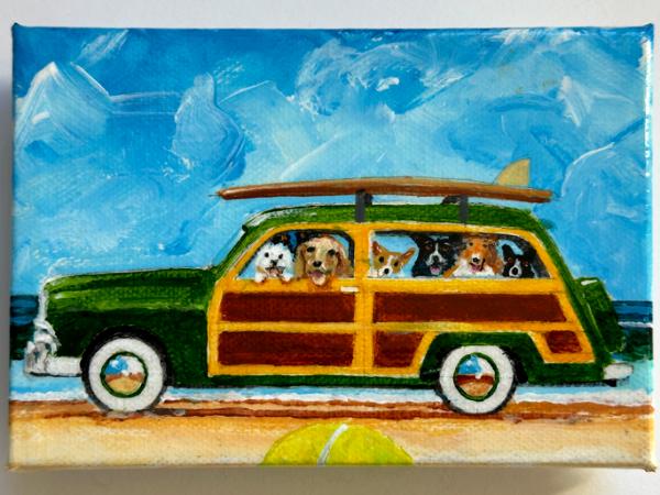 What do dogs dream about during their marathon naps on your best stuff? No one knows for sure, except the dogs, and they’re not telling. In this dogs’ dream, he and his neighborhood pals are driving on the beach in a 1949 Ford woody for a day of surf and sand. They have packed snacks galore and all the necessary equipment except for one key item, a tennis ball. But because of dogs having such good Karma, lo and behold, they roll up to a freshly washed King of Dog Toys, the tennis ball. The...