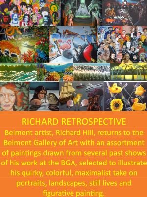 NOW SHOWING Belmont Gallery of Art, Belmont, MA Group Show FAMILY TIES October 28, 2025 - January 30, 2026 Belmont Gallery of Art, Belmont, MA Belmont Art Ass'n Show SHOW OFF SHOW October 7, 2024 - Belmont Gallery of Art, Belmont, MA Solo Show RICHARD HILL RETROSPECTIVE of several solo shows at the BGA September 20 -October 20, 2024 Belmont Gallery of Art, Belmont, MA Juried Group Show BAA 10th Anniversary February 10 - March 31, 2024 Belmont Gallery of Art and the Belmont Public Library, Belmont, MA Juried Group Show MORE THAN WORDS - Art Inspired by Literature Sept 17, 2022 - Oct 30, 2023 Belmont Gallery of Art, Belmont, MA Invitational Group Show FLORA & FAUNA May 21 - June30, 2022 Belmont Gallery of Art, Belmont, MA Juried Group Virtual Show ART HEALS April 1, 2021 - TBD Belmont Gallery of Art, Belmont, MA Solo Show UNMASKED Portraits by Richard Hill September 19, 2019 - September 29, 2021 https://virtualbga.org/unmasked-richard-hill Belmont Gallery of Art, Belmont, MA Juried Group Show ARTFUL NATURE March 6, 2020 - Belmont Gallery of Art, Belmont, MA Juried Group Show 2020 VISION January 16 - February 28, 2020 Belmont Gallery of Art, Belmont, MA Joint Show MY SISTER & ME June 9 - Sept. 1, 2019 Belmont Gallery of Art, Belmont, MA Juried Group Show RHYTHM & HUES September 7 - October 12, 2018 Belmont Gallery of Art, Belmont, MA Small Group Show FIVE PLUS 2 Summer 2018 Belmont Gallery of Art, Belmont, MA Juried Group Show FAIRY TALES, FOLKTALES & FABLES March 23 - May 4, 2018 Belmont Gallery of Art, Belmont, MA Group Show HOME - A Sense of Place October 19 - December 7, 2017 Belmont Gallery of Art, Belmont, MA Solo Show SURFACES June - October 2017