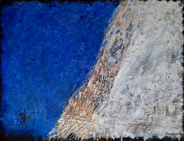 Have you ever dreamed of being on a Blue Planet? Here is an opportunity for you to travel with me while looking at this painting! This composition embodies eternity, greatness, and cosmic rebirth. It is a deeply personal, sensitive creation that symbolizes the universal desire for continuity and balance. I use symbols that express reality and fantasy, which together tell the story of human nature, our perfection, and imperfection. I am inspired by the effects of light. I strive to create paintings that convey a sense of time and place.