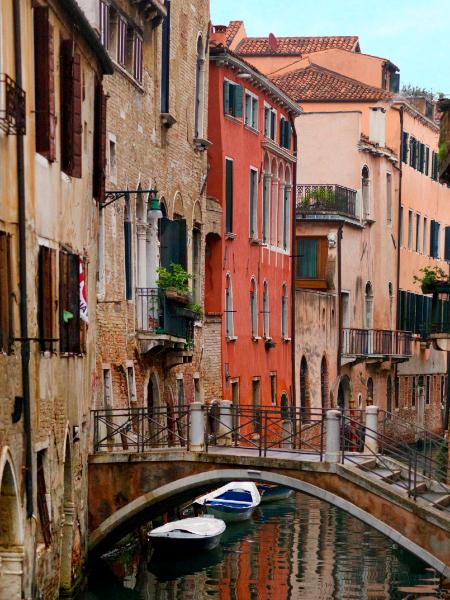 This study of an enchanting canal that Venetians view, float down, cross over as they go about their lives illuminates the ancient quality of this fantastic locale. As the eye studies the architectural details of the warm coral and faded pink edifices from left to right, one has the sensation that they could sink and crumble over into the waters at any time. Yet there is that little yellow open boat on the lower right that anchors the entire scene. It floats on impressionist liquid reflections of those edifices to secure them, hold them up, support that bridge for those who have come and gone through the ages. Sheila O'Rourke, Ph.D.