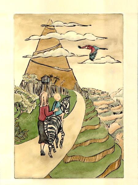 This painting shows two distant figures representing people who come alongside the path to offer much-needed help and guidance along the way. The colorful parrot is an icon of freedom. While the world feels narrowed to become like an exotic alien place, faith and the help of others lifts our eyes to see hope and freedom is possible even on the most difficult of journeys. I want keep this viewpoint and hope to share it with others.