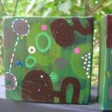 Acrylic and acrylic ink on canvas. 3 paintings, each 4" X 4" X 1.5" (sides painted, no need for frame - sawtooth hanger included)